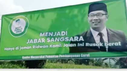 “MENJADI JABAR SANGSARA, hanya di jaman Ridwan Kamil jalan ini rusak” demikian salah satu spanduk terpasang lengkap bergambar foto Ridwan Kamil.