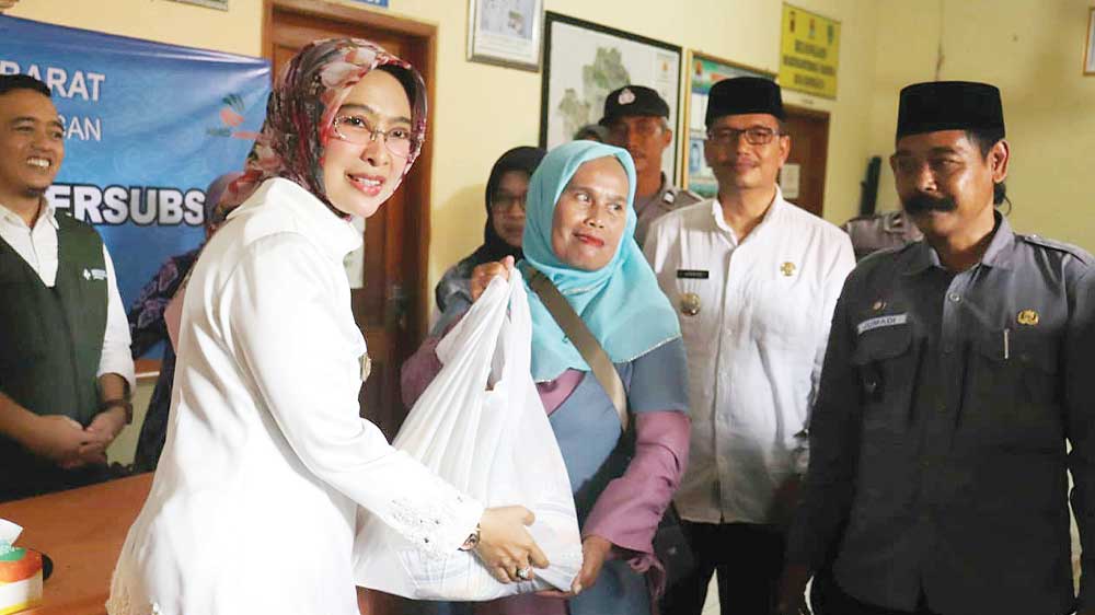 Wakil Bupati Cirebon, Hj. Wahyu Tjiptaningsih, menyerahkan secara simbolis paket bantuan kepada salah seorang warga, Kamis, 13 April 2023.* (Foto: Diskominfo Kabupaten Cirebon)