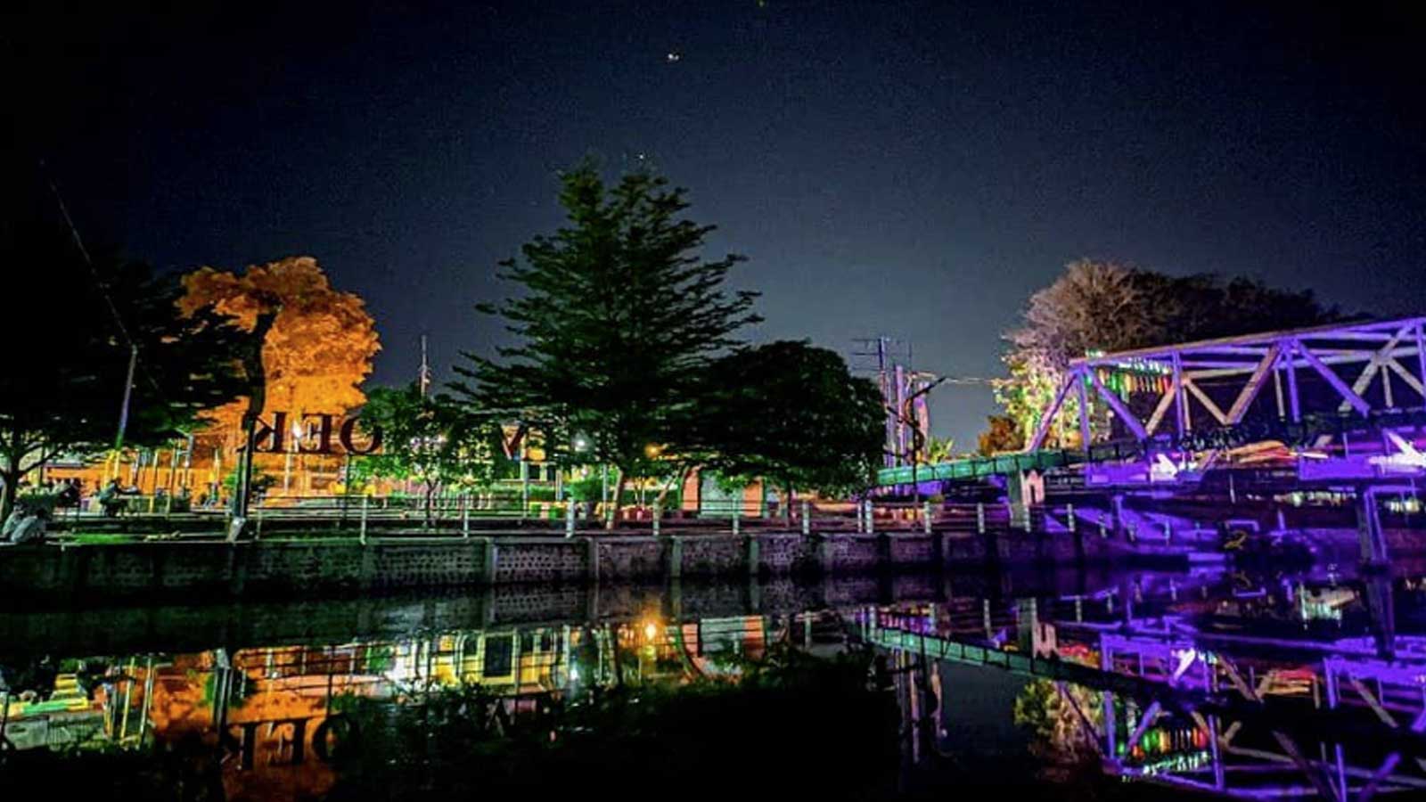 Suasana tempat wisata Taman Cimanuk Indramayu saat malam hari.* (Foto: Instagram @disparbudjabar)