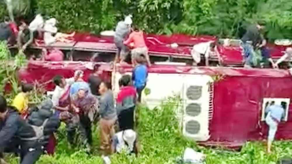 Dari video yang sempat viral beredar, bus meluncur tanpa kendali ke arah bawah, kemudian berbelok kekiri dan hilang dari pandangan kamera. Belakangan diketahui, bus tersebut terperosok masuk ke dalam sungai.