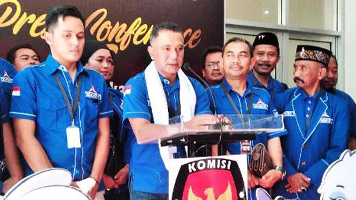KETUA DPD Partai Demokrat Majalengka Fauzan Zemzar dan jajarannya memberikan keterangan pers di kantor KPU setempat, Minggu, 14 Mei 2023.* (Foto: Abdur Rakhman/Suara Cirebon)