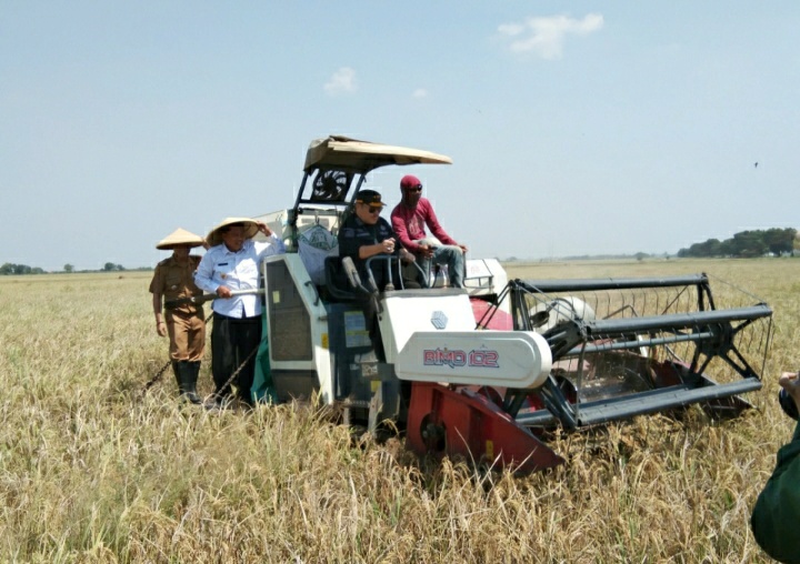 Bersama Wakil Gubernur Jawa Barat, H Uu Ruzhanul Ulum dan Bupati Cirebon, H Imron, MAg serta Kepala Dinas Pertanian Kabupaten Cirebon, Alex Suheriyawan, Irjen Kementan, Jan S Maringka turut melakukan panen menggunakan combine harvester.