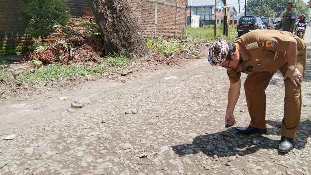 Bupati Cirebon, H Imron MAg saat meninjau jalan rusak di Jalan Nyi Gede Cangkring beberapa waktu lalu.* (Foto: Islah/Dokumen/Suara Cirebon)