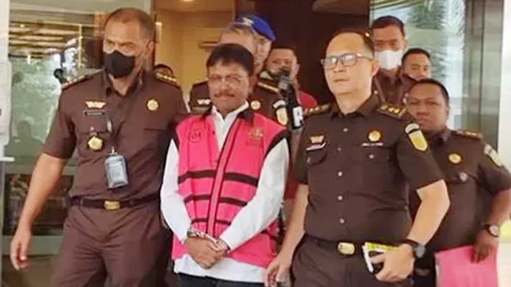 Johnny G Plate mengenakan rompi pink dengan tangan diborgol ditetapkan sebagai tersangka kasus dugaan korupsi proyek pengadaan infrastruktur Base Transceiver Base (BTS) 4G dengan kerugian negara mencapai Rp8,3 triliun.*