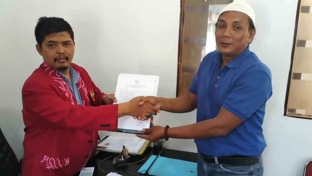 SALAH SEORANG bakal calon ketua KONI Kabupaten Cirebon, Sutardi yang menyerahkan berkas pendaftaran kepada panitia Musorkab, Selasa (23/5/2023).* Foto: Dekur/Suara Cirebon