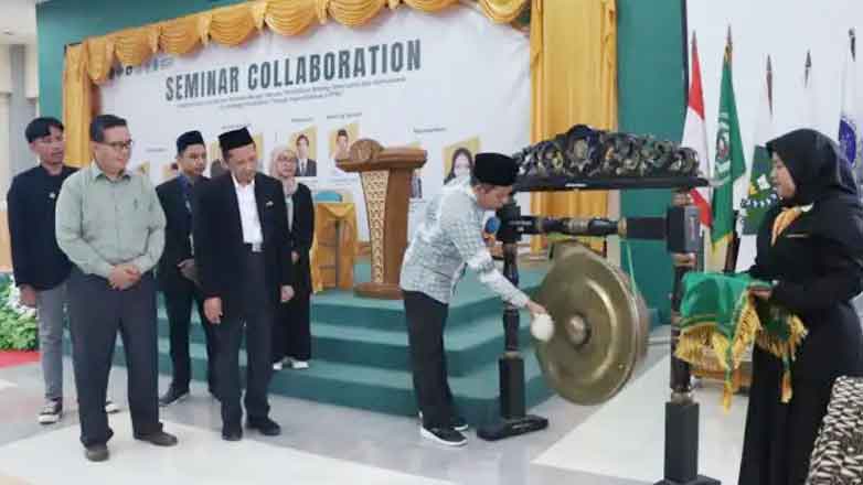 Rektor IAIN Cirebon, Prof Dr H Aan Jaelani MAg memukul gong sebagai tanda dibukanya kegiatan Seminar Collaboration di kampus setempat.*
