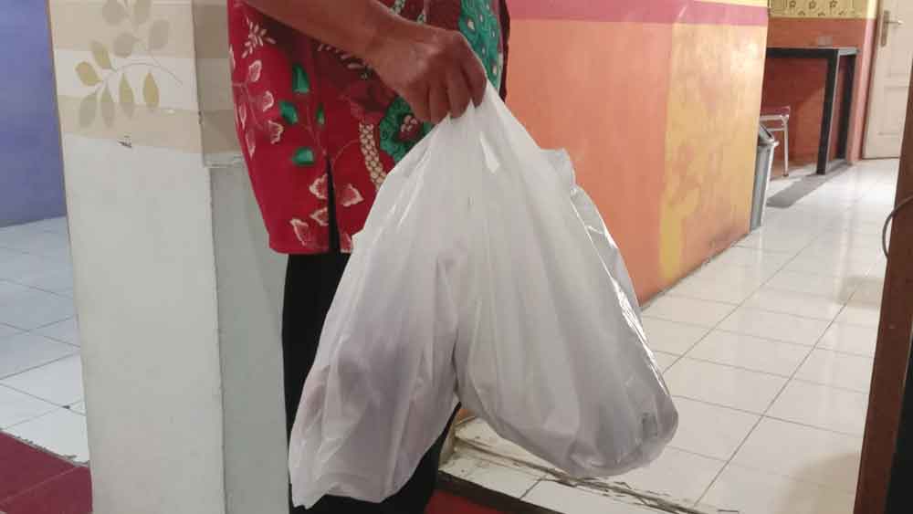 Seorang warga membawa barang bawaannya menggunakan kantong kresek plastik.* (Foto: Islah/Suara Cirebon)