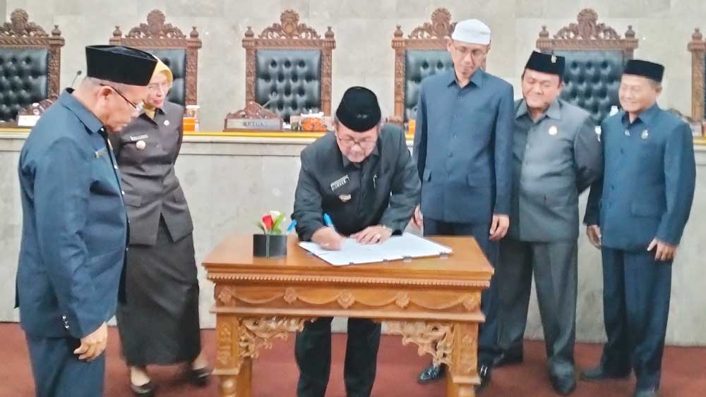 Bupati Cirebon, H Imron menandatangani berita acara, saat menghadiri rapat paripurna di DPRD setempat, belum lama ini.* (Foto: Dede Kurniawan/Suara Cirebon)