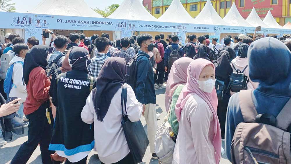 Ribuan pencari kerja memadati area job fair yang diselenggaran Dinas Ketenagakerjaan Kabupaten Cirebon di SMKN 1 Gunungjati, Senin, 31 Juli 2023.* (Foto: Islah/Suara Cirebon)