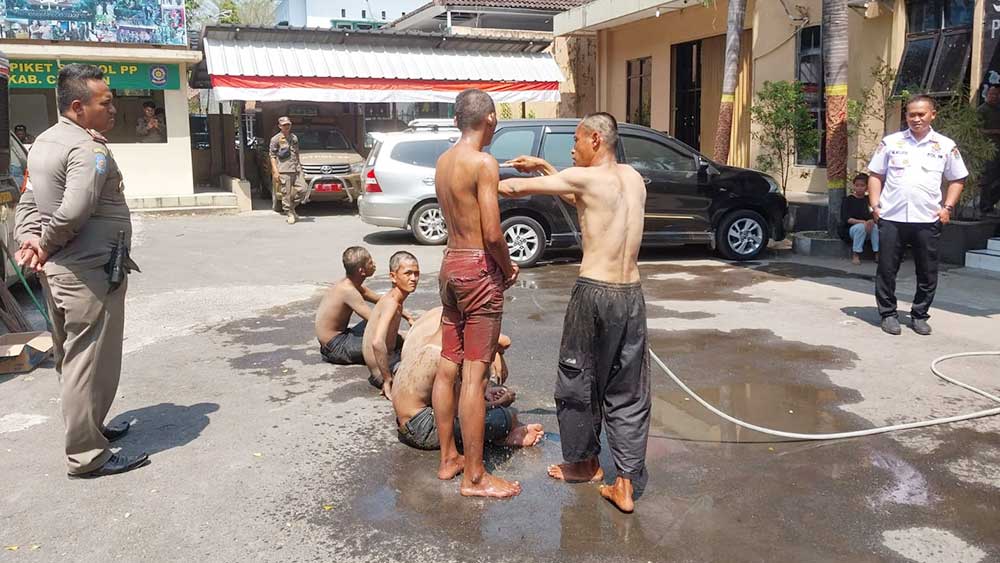 Pantauan Suara Cirebon, 9 anak punk yang diamankan itu didata oleh petugas. Mereka yang semula terlihat kotor pun kemudian disuruh membersihkan diri di depan Kantor Satpol PP Kabupaten Cirebon dengan air bersih.