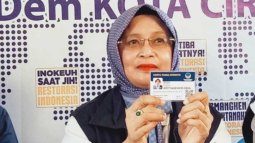 Mantan anggota Fraksi Gerindra DPRD Kota Cirebon, Affiati menunjukkan KTA Nasdem. Saat ini SK Gubernur Jabar terkait pemberhentian Affiati telah turun dan segera dilakukan PAW.* (Foto: Surya/Dokumen/Suara Cirebon)