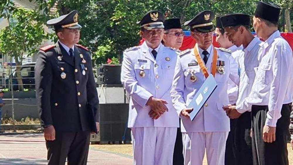 BUPATI Majalengka, H Karba Sobahi secara simbolis menyerahkan surat keputusan remisi untuk warga binaan Lapas Kelas II B Majalengka dalam upacara HUT ke-78 RI di GGM.* (Foto: Abdur Rakhman/Suara Cirebon)