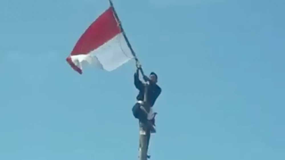Hal uniknya, bendera merah putih itu dinaikan ke ujung tiang dengan cara si lelaki itu menaiki tiang.