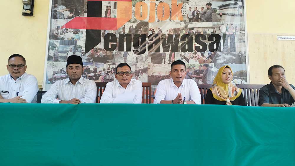 Ketua Bawaslu Kabupaten Cirebon masa jabatan 2023-2028, Sadaruddin Parapat bersama komisioner terpilih dan Korsek, Ayip Saduloh (paling kiri), saat jumpa pers, Senin, 21 Agustus 2023.* (Foto: Dede Kurniawan/Suara Cirebon)