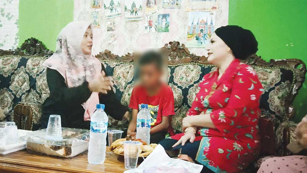 Ketua KPAID Kabupaten Cirebon, Fifi Sofiah (kanan) saat mengunjungi rumah korban perundungan, Kamis, 31 Agustus 2023.* (Foto: Vicky/Suara Cirebon)