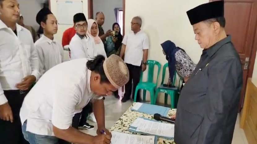 Ketua BPD Citemu, Kecamatan Mundu, Kabupaten Cirebon, Lukman Nurhakim (kiri) menandatangani berita acara pelantikan dan pengambilan sumpah jabatan BPD setempat periode 2023-2029, Jumat, 6 Oktober 2023.* (Foto: Baim/Suara Cirebon)