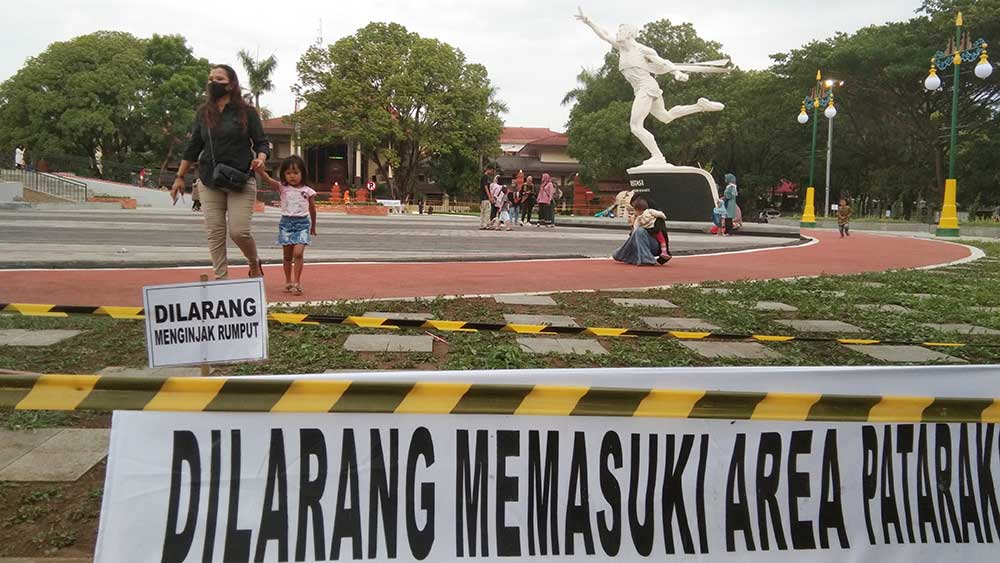Ratusan warga yang masuk ke area tersebut, bebas berjalan hingga tak sedikit yang sengaja menginjak rumput yang belum lama ditanam itu.