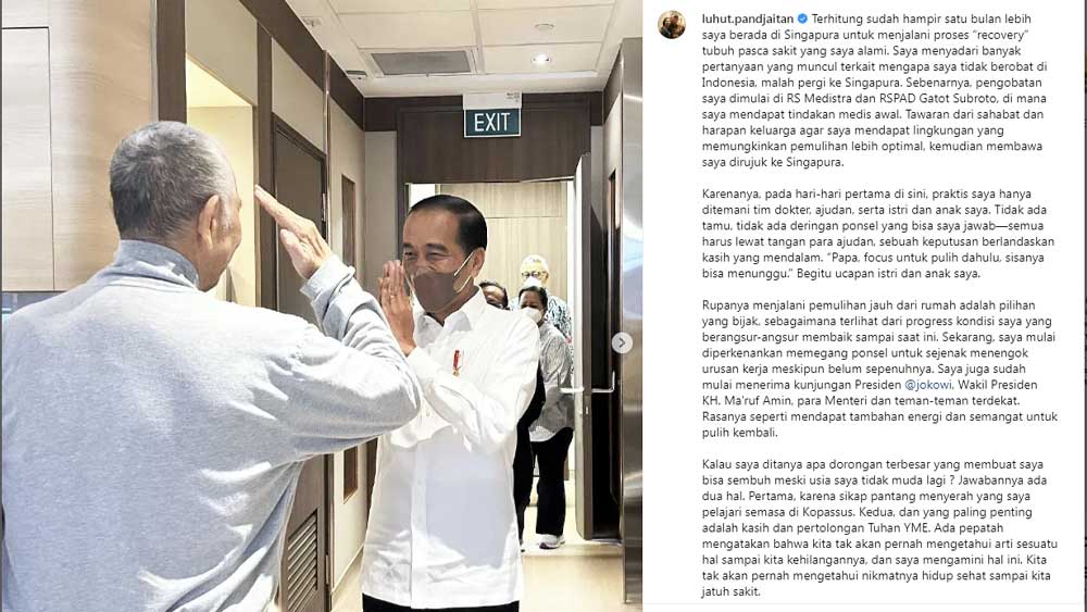 BUkti LBP telah sembuh bisa dilihat dari tulisan curhatnya yang cukup panjang di akun Instagramnya @luhut.pandjaitan yang diposting Sabtu siang, 4 November 2023.