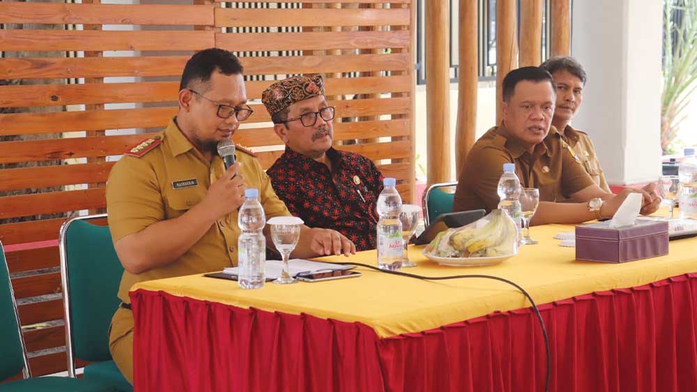 BUPATI Cirebon, H Imron MAg (batik hitm merah) dalam kegiatan rapat kordinasi di Kecamatan Suranenggala, Selasa, 7 November 2023.* (Foto: Vicky/Suara Cirebon)