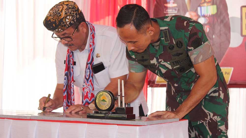 BUPATI Cirebon, H Imron MAg dan Dandim 0620/Kabupaten Cirebon, Letkol Inf Afriandy Bayu Laksono menandatangani berita acara penutupan BSMSS tahun 2023 di Desa Sarabau, Rabu, 22 November 2023.* (Foto: Vicky/Suara Cirebon)