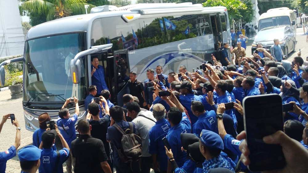 Ketua Majelis Tinggi Partai Demokrat, Susilo Bambang Yudhoyono (SBY) disambut ratusan kader demokrat saat tiba di salah satu hotel di Kota Cirebon untuk memberikan pengarahan dan pembekalan untuk sejumlah caleg DPR RI, DPRD provinsi, DPRD kota dan kabupaten, Kamis, 30 November 2023.* (Foto: Surya/Suara Cirebon)