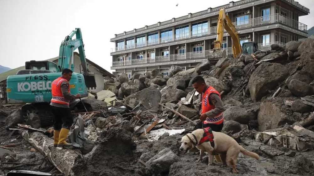 Anjing pelacak harus ekstra keras mengendus kemungkinan jasad korban hilang. Penciuman mereka terkendala banyaknya bongkahan batu besar yang terbawa air bah saat banjir bandang menerjang.