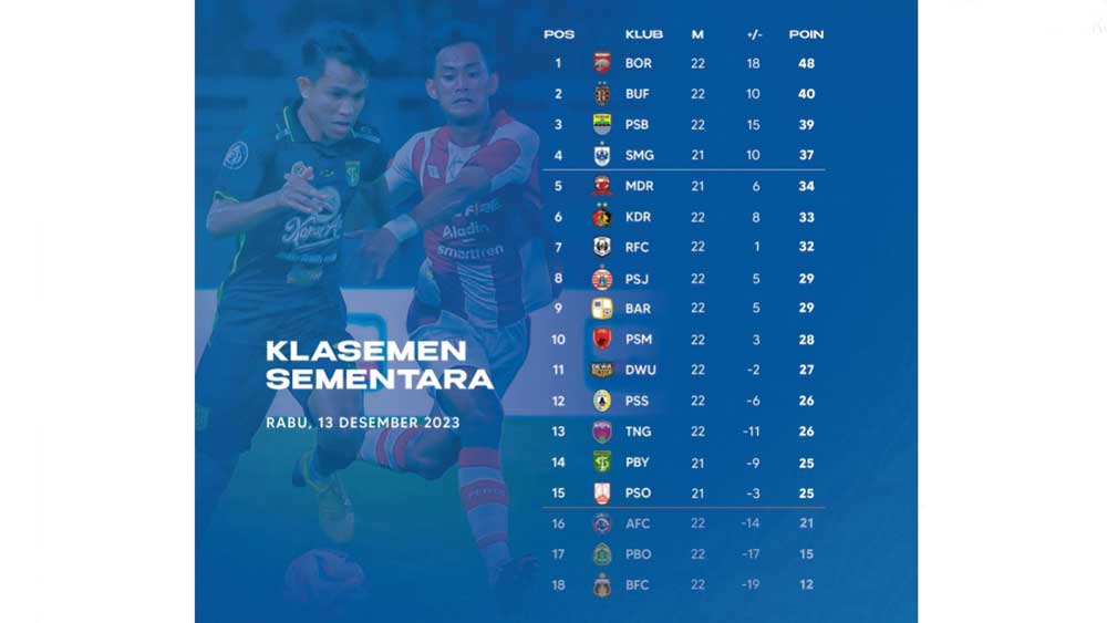 Bali United berada sementara sebagai runner up dengan 40 poin. Sedangkan Persib hanya selisih 1 poin di urutan ketiga dengan 39 poin.