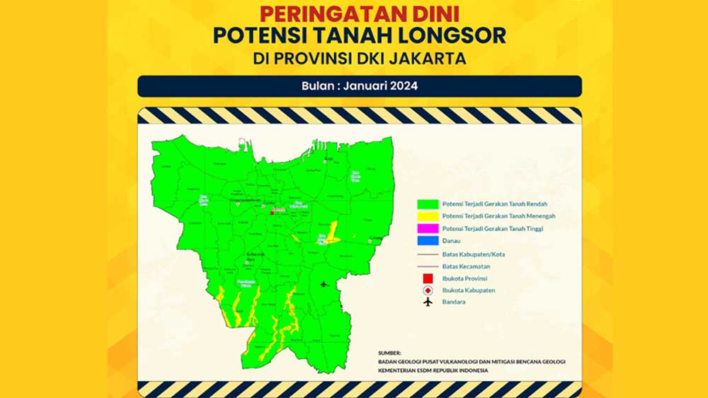 “Ada kerentanan gerakan tanah dikaitkan dengan peta prakiraan curah hujan di Jakarta. Dari situ diperoleh potensi daerah yang rawan tanah longsor,” demikian penjelasan yang disampaikan BMBD melalui akun Instagram @bpbddkijakarta, Rabu 10 Januari 2024.