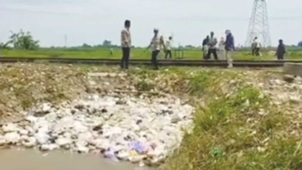 KONDISI saluran irigasi di bawah jalan kereta api double track di Desa Cibogo, Kecamatan Waled, Kabupaten Cirebon, yang mengalami pendangkalan serta banyak tumpukan sampah, belum lama ini.* (Foto: Dokumen/Suara Cirebon)