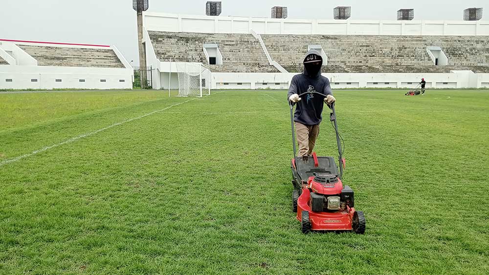 Perawatan rumput di Stadion Watubelah Cirebon yang berstandar FIFA, Rabu, 28 Februari 2024.* (Foto: Islah/Suara Cirebon)