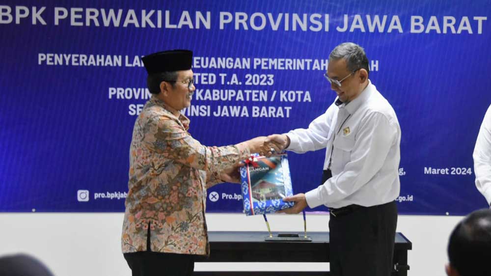 Bupati Cirebon, H Imron MAg (kiri) menyerahkan langsung LKPD Kabupaten Cirebon ke BPK di Gedung BPK Perwakilan Jawa Barat, Senin, 18 Maret 2024.* (Foto: Diskominfo Kabupaten Cirebon)