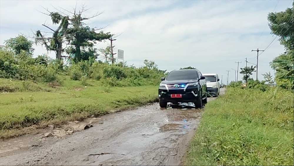Kendaraan dinas Wakil Bupati Cirebon saat melintasi jalan menuju Desa Tawangsari, Kecamatan Losari, yang mengalami kerusakan, Senin, 18 Maret 2024.* (Foto: Baim/Suara Cirebon)