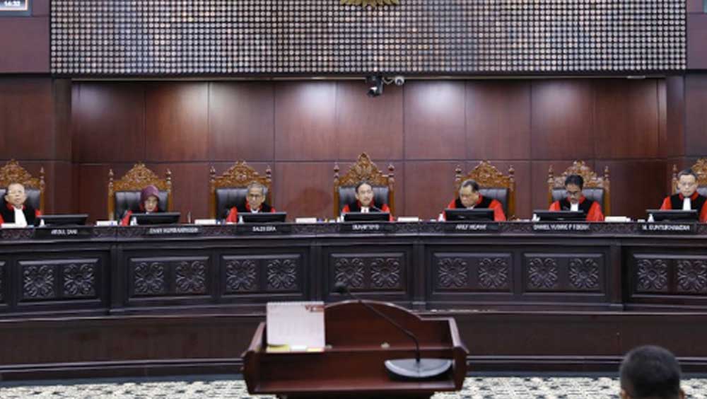 Dari 9 hakim MK, ada 1 hakim yang berdasar keputusan Mahkamah Kehormatan MK (MKMK), dilarang mengikuti sidang sengketa hasil Pilpres 2024.