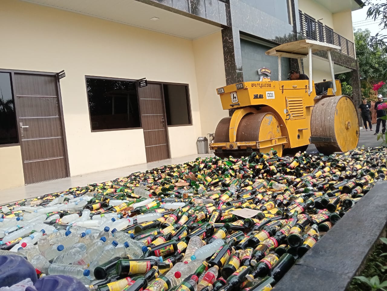 Kemudian, ribuan botol yang masih berisi miras dari berbagai merk itu dihancurkan dengan cara dilindas menggunakan alat berat yang telah disiapkan.