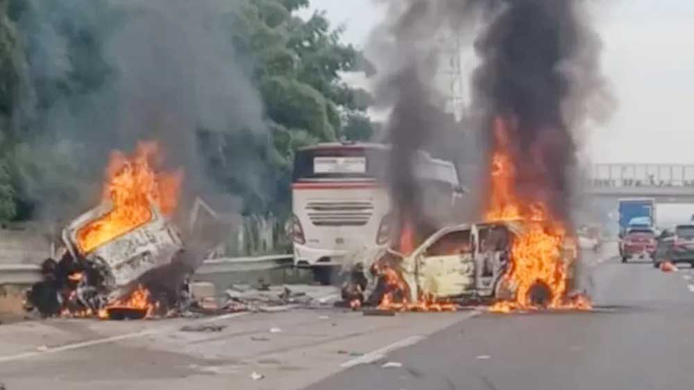 Dahsyatnya kecelakaan maut di Tol Jakarta Cikampek hingga kendaraan terbakar dan menelan 12 korban jiwa pada Senin pagi, pukul 07.00 WIB, 8 April 2024.*