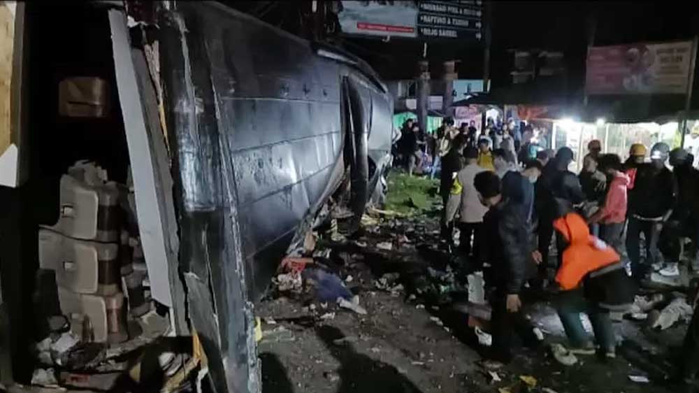 Bus pariwisata yang membawa rombongan siswa SMK tersebut mengalami rem blong di turunan Lembah Sari, akhirnya menabrak mobil dan sepeda motor serta terguing.