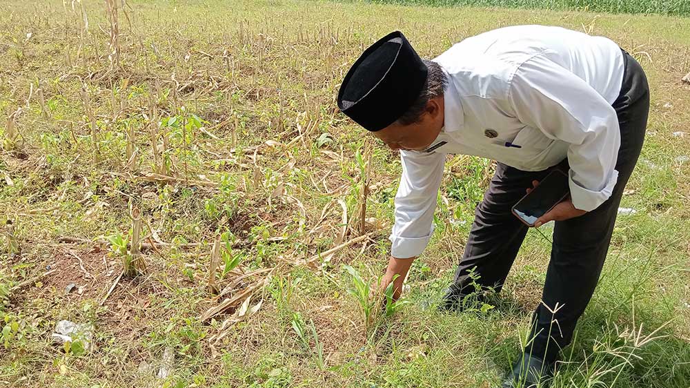 Kuwu Beber, momon menunjukkan tanaman sorgum yang sudah dipotong saat panen, namun kini sudah mulai tumbuh lagi, belum lama ini.* (Foto: Islah/Suara Cirebon)