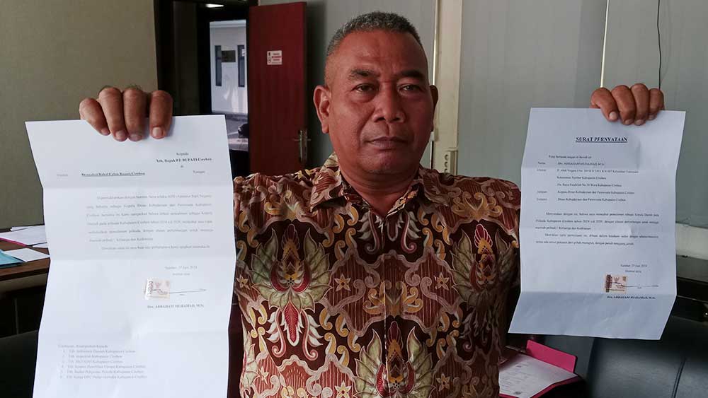 Abraham Mohammad menunjukkan surat tidak melanjutkan proses pencalonan dalam Pilkada Kabupaten Cirebon 2024.* (Foto: Islah/Suara Cirebon)