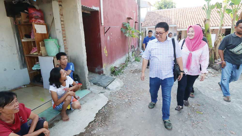Bacawalkot Cirebon dari Partai Demokrat, Handarujati didampingi istri menyapa warga Kriyan Barat, Jumat, 19 Juli 2024.* (Foto: Surya/Suara Cirebon)