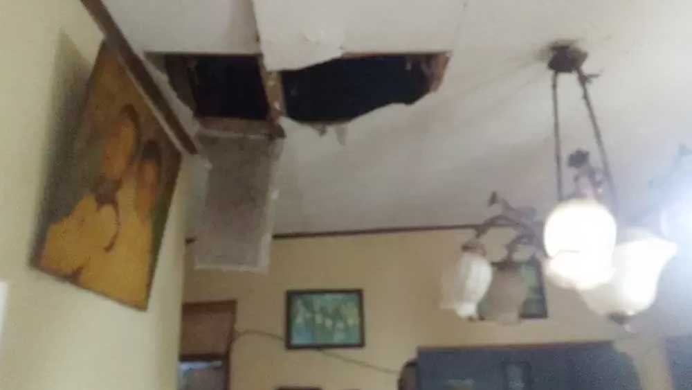 Terlihat atap jebol dan batu bata dari dinding yang roboh terlihat berantakan di dalam rumahnya.