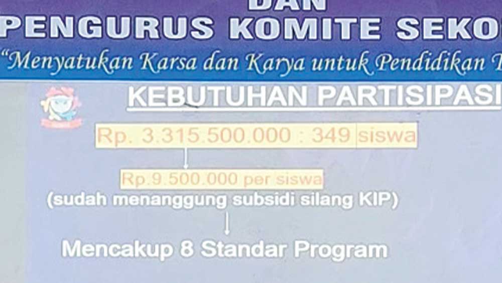 “Kemarin ada yang WA ke saya, berupa foto-foto mungkin foto itu berupa informasi menunjukkan ada pertemuan antara komite sekolah, puhak sekolah dan juga orang tua siswa di salah satu SMA di Jawa Barat. Informasi foto yang pertama berisi kebutuhan partisipasi senilai Rp3,315 dibagi 349 siswa sehingga hasilnya Rp9,5 per siswa,” kata Ono di akun tiktok @ono_surono, Ahad, 28 Juli 2023.