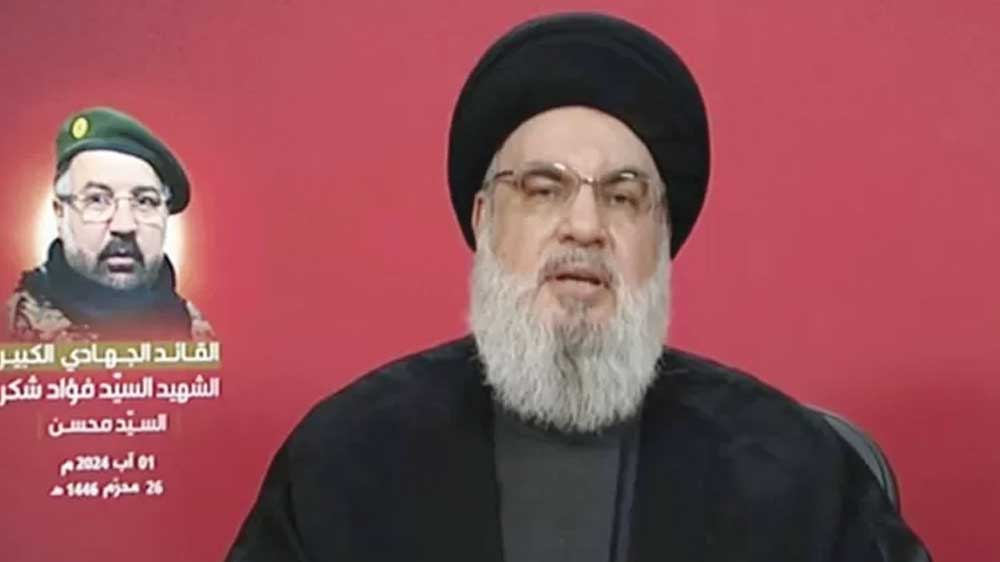 Pidato Pemimpin Hizbullah, Hassan Nasrallah yang berlasungkawa atas kematian kepala staf Hizbullah Fuad Shukr.* (Foto: Tangkapan layar Al-Manar TV)
