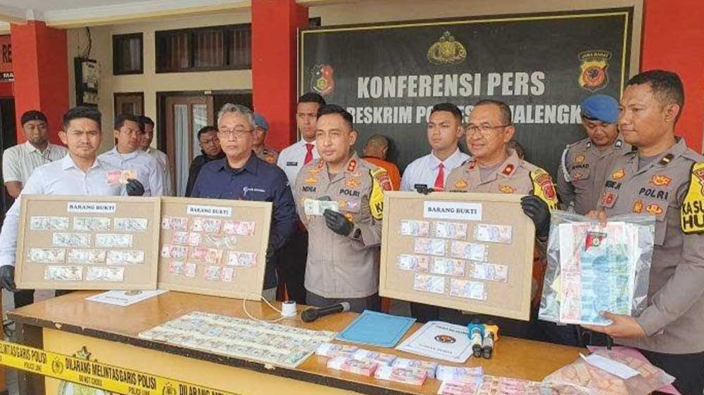 “Dari hasil penggeledahan, kami menyita uang palsu pecahan 100 ribuan dan 10 ribuan serta dolar palsu masing-masing satu pak,” ujar Indra Novianto saat konferensi pers di Mapolres Majalengka, Selasa, 24 September 2024.