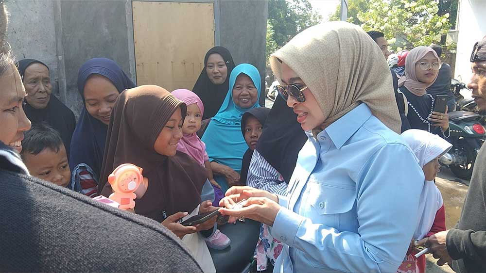 Calon Bupati Cirebon, Wahyu Tjiptaningsih berbincang dengan warga saat menghadiri kegiatan karnaval peringatan Maulid Nabi Desa Wanasaba kidul, Ahad, 29 September 2024.* (Foto: Vicky/Suara Cirebon)