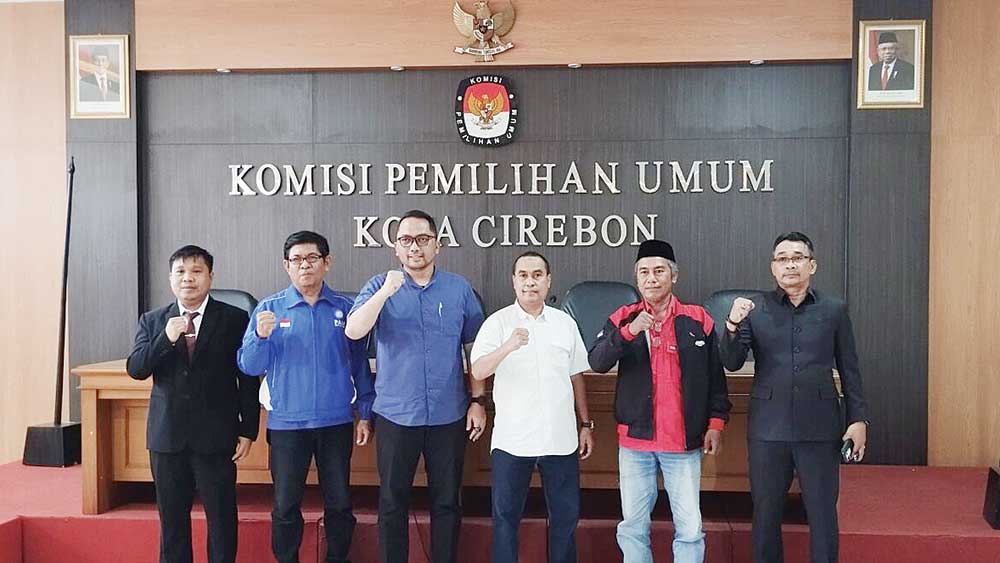Ketua KPU Kota Cirebon, Mardeko (paling kanan) bersama Anton Octavianto dan Umar Stanis Clau didampingi pengurus partai masing-masing, belum lama ini.* (Foto: Istimewa)