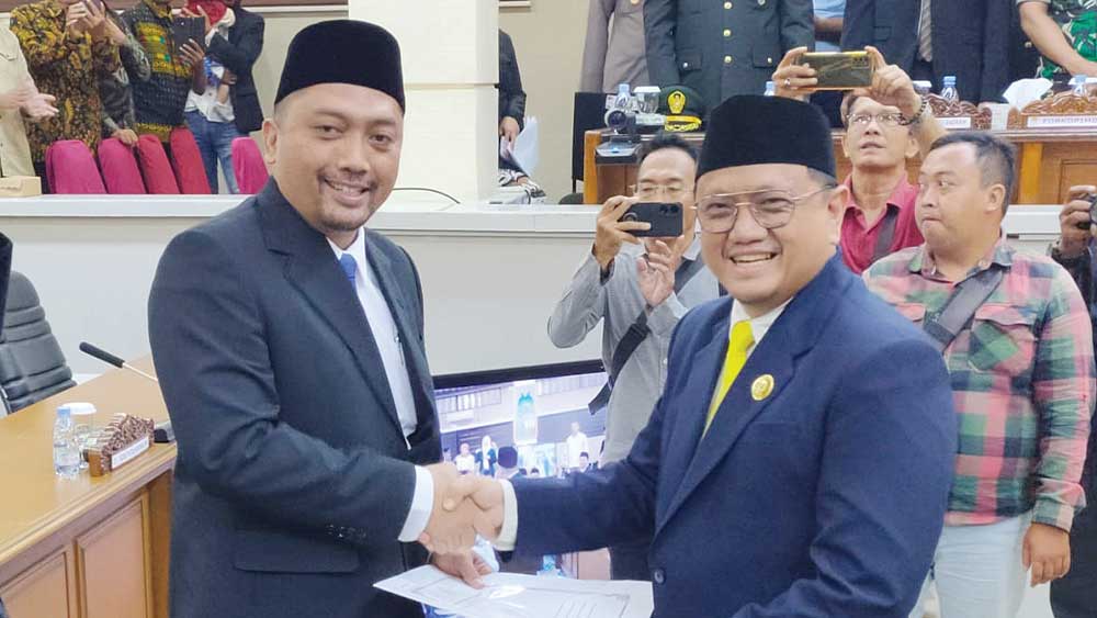 Ketua DPRD Kota Cirebon, Andrie Sulistio (kanan) menyalami Anton Octavianto usai resmi dilantik sebagai anggota DPRD Kota Cirebon sisa masa jabatan 2024-2029, Senin, 14 Oktober 2024.* (Foto: Surya/Suara Cirebon)