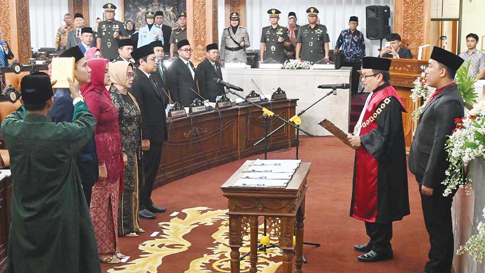 Pengucapan sumpah janji empat pimpinan DPRD Kabupaten Cirebon dipimpin Ketua Pengadilan Negeri (PN) Kabupaten Cirebon, Achmad Ukayat, Rabu, 23 Oktober 2024.* (Foto: Dede Kurniawan/Suara Cirebon)