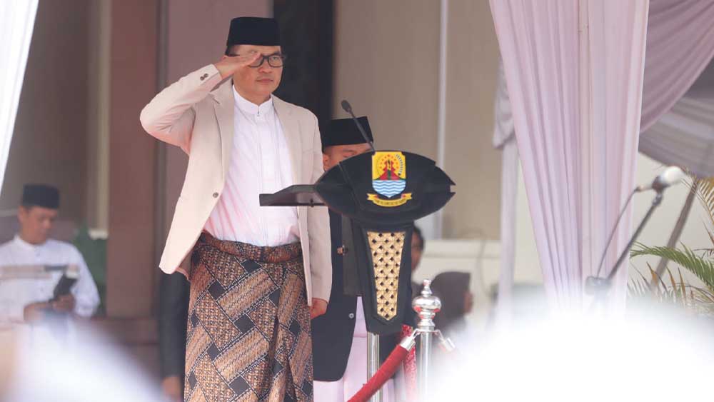 langsung Pj Bupati Cirebon, Drs H Wahyu Mijaya SH MSi saat memimpin upacara peringatan Hari Santri Nasional 2024 bertempat di halaman kantor bupati setempat, Selasa, 22 Oktober 2024.* (Foto: Islah/Suara Cirebon)