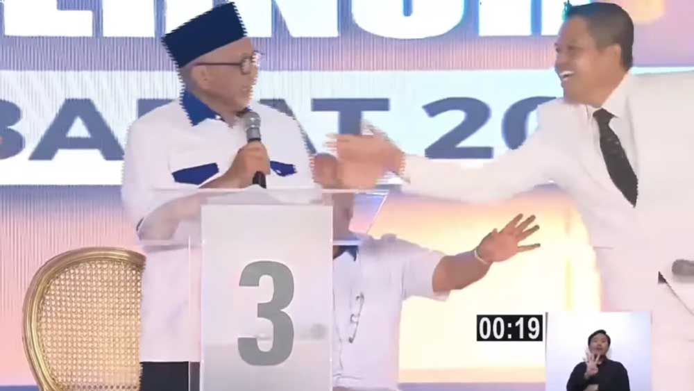 Momen lucu ini terjadi pada sesi antar paslon saling melempar pertanyaan. Di sesi ini, sesuai aturan debat publik yang digelar Komisi Pemilihan Umum atau KPU Jabar, antar paslon saling melempar pertanyaan.