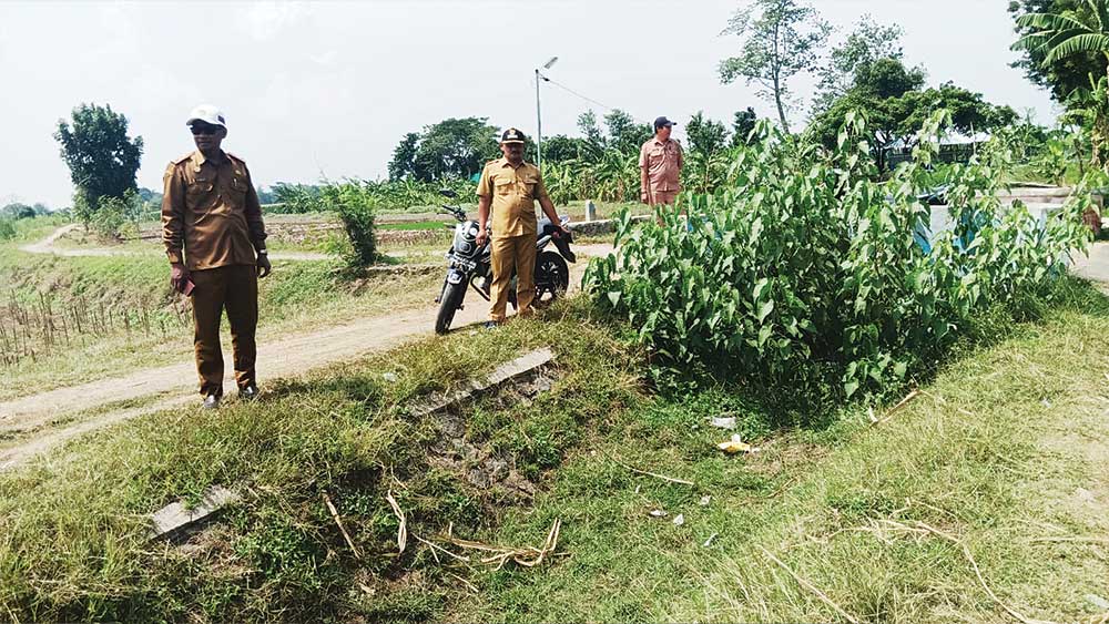 Kuwu Desa Serang Kulon, Alimunidin ( kiri) bersama Kuwu Serang Wetan, Setia Budi, saat memantau kondisi irigasi yang mengering walaupun di musim hujan, Selasa, 19 November 2024.* (Foto: Baim/Suara Cirebon)